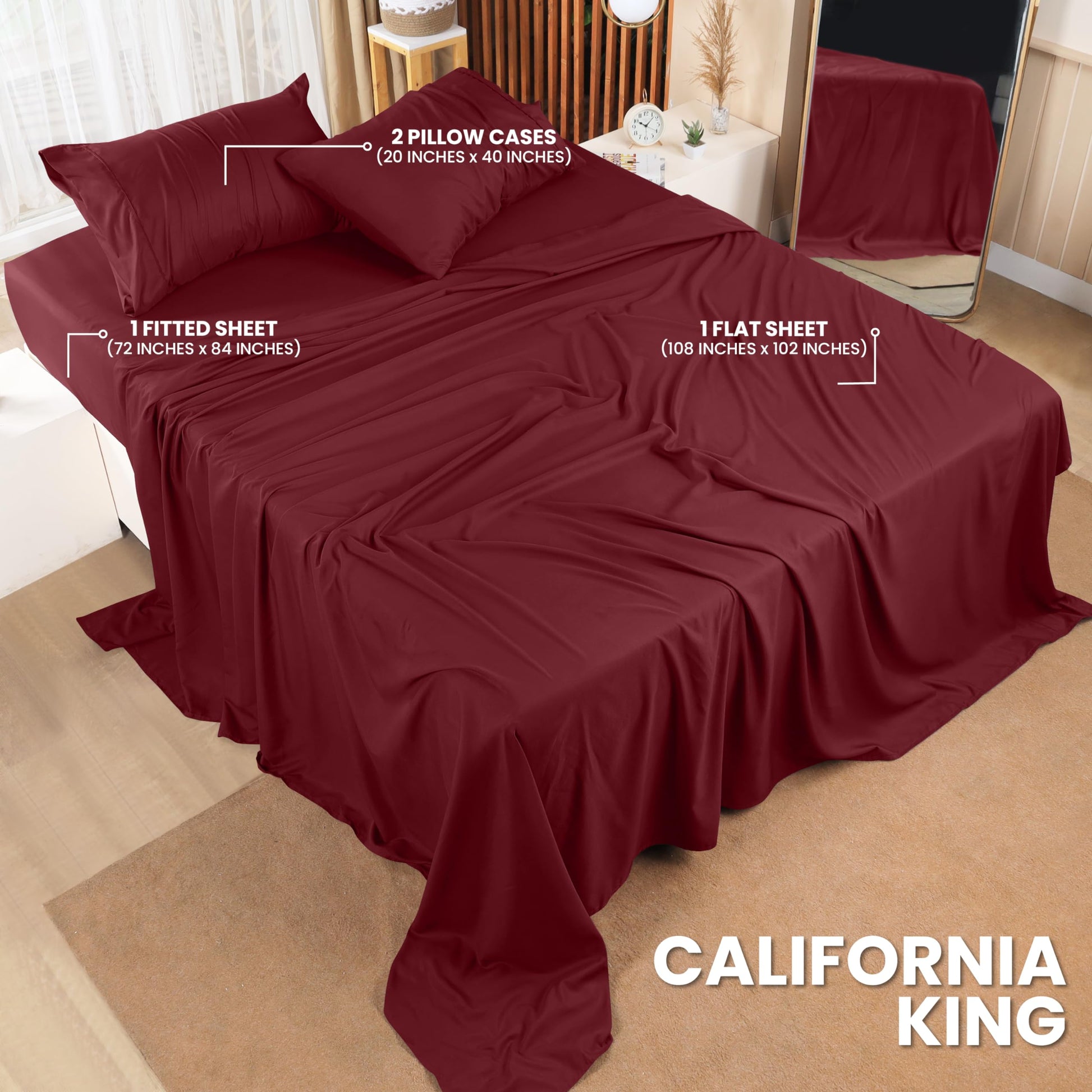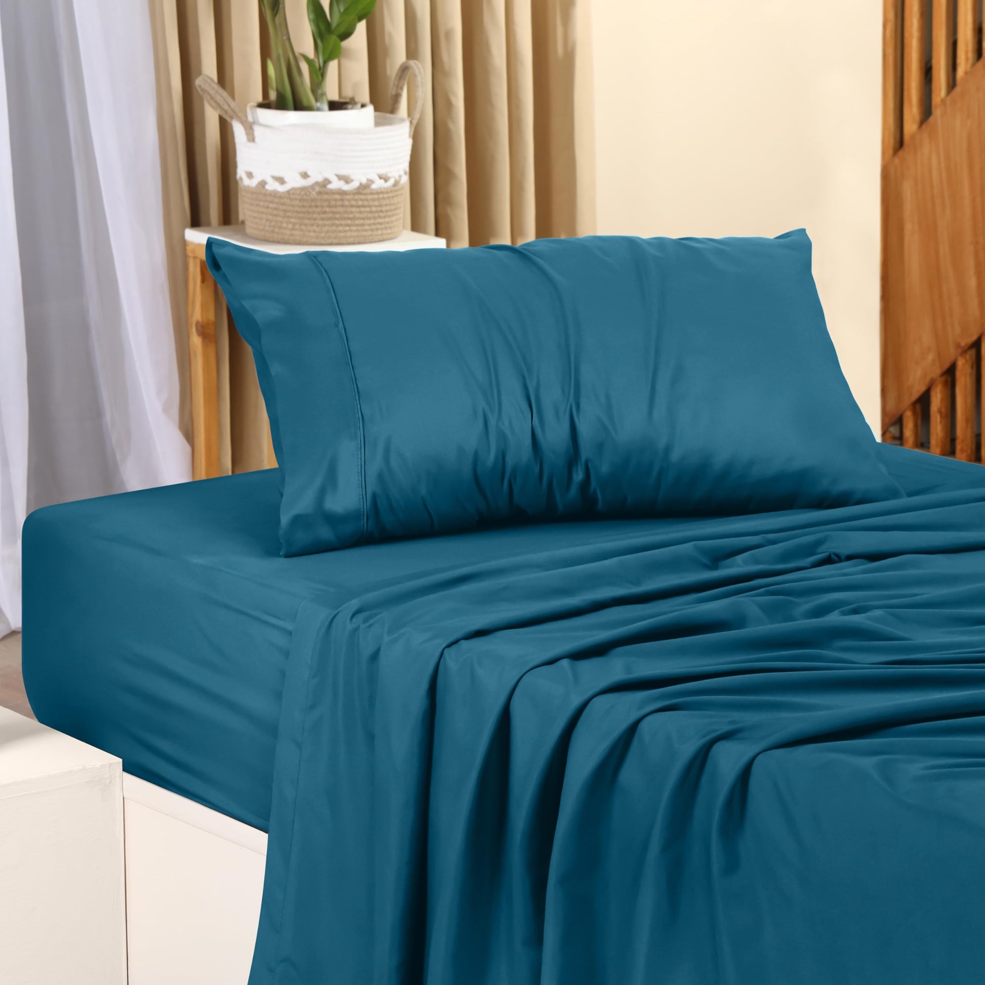 - Bed Sheet Set - Queen size 4-piece bed sheets set comprising of 1 flat sheet measuring 90 by 102 inches with a 2 inches self-hem, 1 fitted sheet measuring 60 by 80 inches covering mattresses upto 15 inches drop height, and 2 pillowcases measuring 20 by 30 inches each with a 4 inches hem
